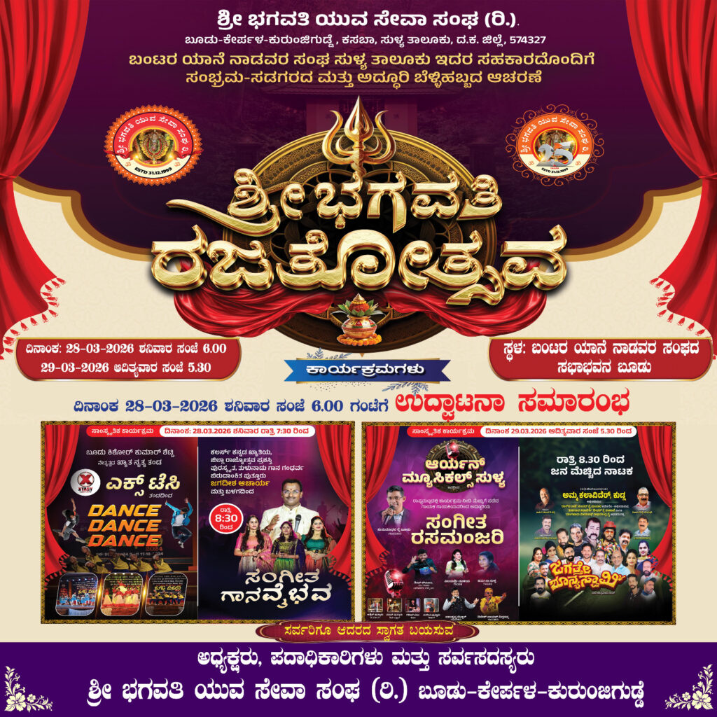 ಸುಳ್ಯ:ಬೂಡು-ಕೇರ್ಪಳ- ಕುರುಂಜಿಗುಡ್ಡೆ ಭಾಗದಲ್ಲಿ ಕ್ರಿಯಾಶೀಲರಾಗಿರುವ ಶ್ರೀ ಭಗವತಿ ಯುವ ಸೇವಾ ಸಂಘದ ಅದ್ದೂರಿ ಬೆಳ್ಳಿ ಹಬ್ಬ ಸಮಾರಂಭ ‘ಶ್ರೀಭಗವತಿ ರಜತೋತ್ಸವ’ ಮಾ.28 ಮತ್ತು 29ರಂದು ಬಂಟರ ಯಾನೆ ನಾಡವರ ಸಂಘದ ಸಭಾಭವನದಲ್ಲಿ ನಡೆಯಲಿದೆ.ಯುವ ಸೇವಾ ಸಂಘವು 25 ವರ್ಷ ಪೂರೈಸಿದ ಹಿನ್ನಲೆಯಲ್ಲಿ