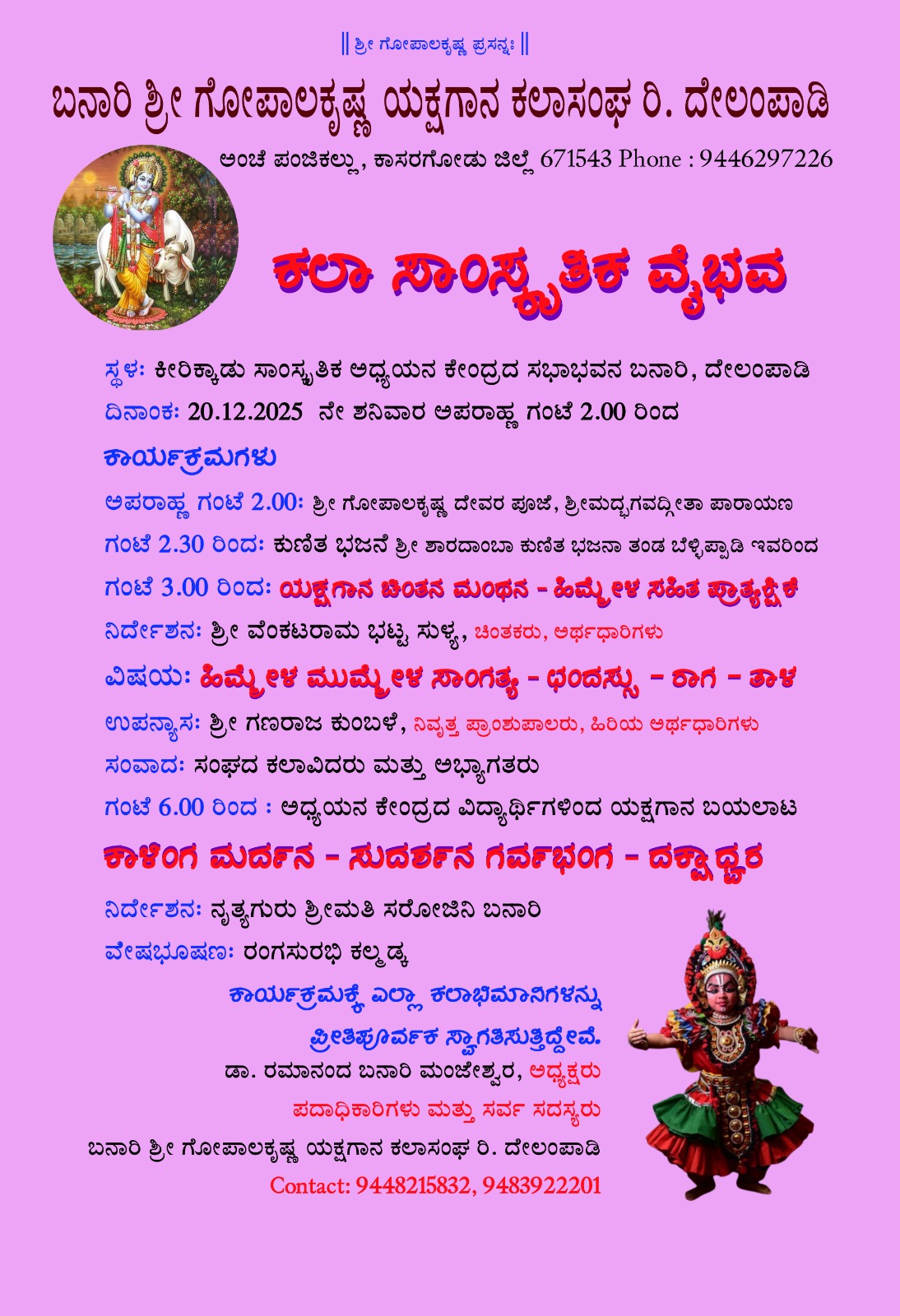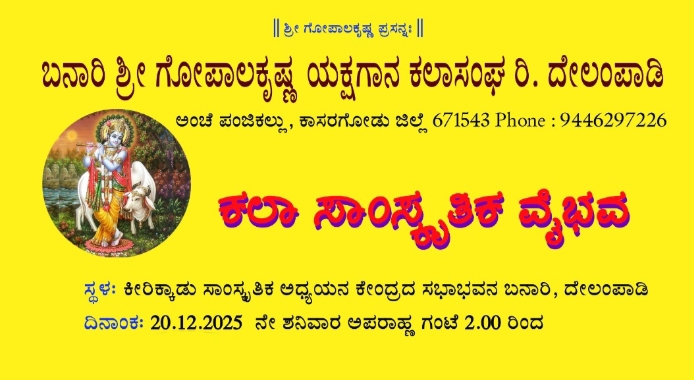 ಬನಾರಿ:ದೇಲಂಪಾಡಿಯ ಬನಾರಿ ಶ್ರೀ ಗೋಪಾಲಕೃಷ್ಣ ಯಕ್ಷಗಾನ ಕಲಾಸಂಘದ ವತಿಯಿಂದ ಕಲಾ ಸಾಂಸ್ಕೃತಿಕ ವೈಭವ ಡಿ.20ರಂದು ಶನಿವಾರ ಅಪರಾಹ್ನ 2ರಿಂದ ಬನಾರಿಯ ಕೀರಿಕ್ಕಾಡು ಸಾಂಸ್ಕೃತಿಕ ಅಧ್ಯಯನ ಕೇಂದ್ರದ ಸಭಾಂಗಣದಲ್ಲಿ ನಡೆಯಲಿದೆ.ಅಪರಾಹ್ನ ಗಂಟೆ 2ರಿಂದ ಶ್ರೀ ಗೋಪಾಲಕೃಷ್ಣ ದೇವರ ಪೂಜೆ, ಶ್ರೀಮದ್ಭಗವದ್ಗೀತಾ ಪಾರಾಯಣ ನಡೆಯಲಿದೆ.2.30 ರಿಂದ ಶ್ರೀ ಶಾರದಾಂಬಾ ಕುಣಿತ ಭಜನಾ ತಂಡ ಬೆಳ್ಳಿಪ್ಪಾಡಿ ಇವರಿಂದ ಕುಣಿತ ಭಜನೆ ನಡೆಯಲಿದೆ.