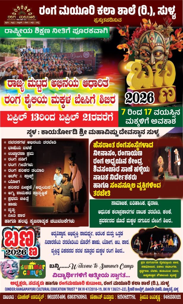 ಏಪ್ರಿಲ್ 13 ರಿಂದ 21 (2026)ರವರೆಗೆ ಸುಳ್ಯದ ಕಾಯರ್ತೋಡಿ ಶ್ರೀ ಮಹಾವಿಷ್ಣು ದೇವಾಲಯದ ಆವರಣದಲ್ಲಿ ನಡೆಯಲಿರುವ ಶಿಬಿರದ ದಾಖಲಾತಿ ಈಗಾಗಲೇ ಆರಂಭಗೊಂಡಿದ್ದು, ಏಪ್ರಿಲ್ 08, 2026 ರ ಒಳಗಾಗಿ, ಆಸಕ್ತ ವಿದ್ಯಾರ್ಥಿಗಳು ಸಂಪರ್ಕಿಸಬಹುದಾಗಿ ತಿಳಿಸಲಾಗಿದೆ.