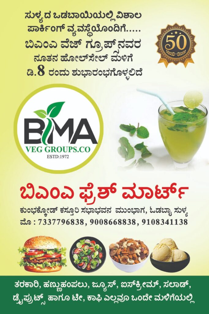 ಸುಳ್ಯ:ಸುಳ್ಯದ ಒಡಬಾಯಿಯಲ್ಲಿ ಬಿಎಂಎ ವೆಜ್ಜ್ ಗ್ರೂಪ್ಸ್ ನವರ ನೂತನ ವೊಲ್ ಸೆಲ್ ಮಳಿಗೆ ಡಿ.8 ರಂದು ಶುಭಾರಂಭ ಗೊಳ್ಳಲಿದೆ.ವಿಶಾಲ ಪಾರ್ಕಿಂಗ್ ವ್ಯವಸ್ಥೆಯೊಂದಿಗೆ ಆರಂಭಗೊಳ್ಳುವ ಬಿಎಂಎ ಪ್ರೆಶ್ ಮಾರ್ಟ್ ನಲ್ಲಿ ಹೋಲ್ ಸೇಲ್ ದರದಲ್ಲಿ ತರಕಾರಿ ಮತ್ತು