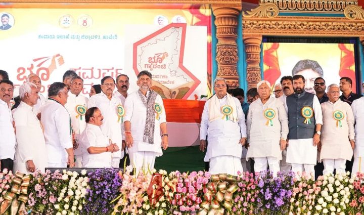 ಹಾವೇರಿ:ರಾಜ್ಯ ಕಾಂಗ್ರೆಸ್ ಸರ್ಕಾರ ಅಧಿಕಾರಕ್ಕೆ ಬಂದು 1000 ದಿನಗಳನ್ನು ಪೂರೈಸಿದ ಹಿನ್ನಲೆಯಲ್ಲಿ ಹಾವೇರಿ ನಗರದ ಹೊರವಲಯದ ಅಜ್ಜಯ್ಯ ದೇವಸ್ಥಾನದ ಆವರಣದಲ್ಲಿ ಬೃಹತ್ ಸಾಧನಾ ಸಮಾವೇಶ ಮತ್ತು ‘ಭೂ ಗ್ಯಾರಂಟಿ ಸಮರ್ಪಣಾ ಸಮಾವೇಶ’ ಆಯೋಜಿಸಲಾಯಿತು.ಸಾಧನಾ ಸಮಾವೇಶ ಮತ್ತು ಒಂದು ಲಕ್ಷ ಮಂದಿ ಫಲಾನುಭವಿಗಳಿಗೆ