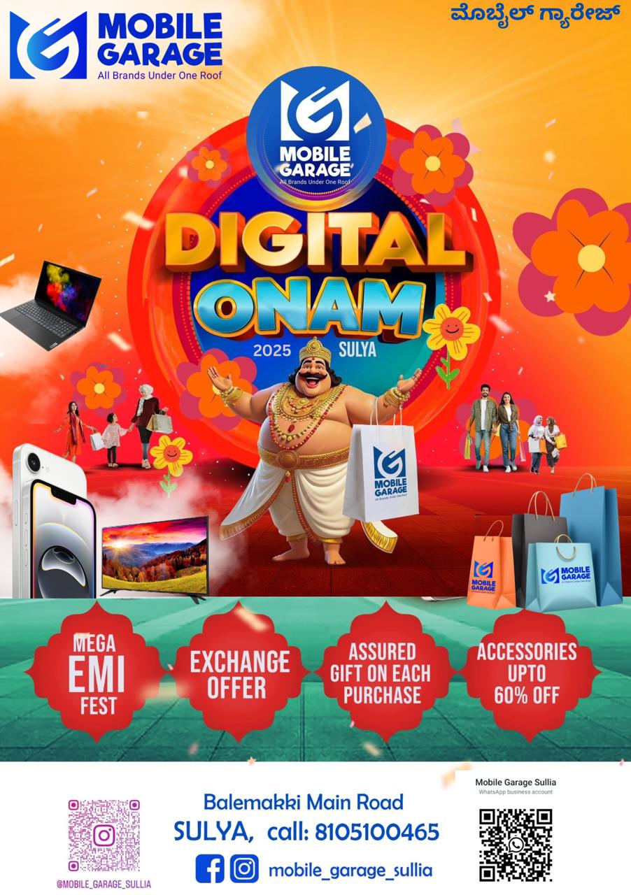 ಸುಳ್ಯ:ಸುಳ್ಯದ ಅತೀ ದೊಡ್ಡ ಮೊಬೈಲ್ ಶೋರೂಮ್ ಹಾಗೂ ಡಿಜಿಟಲ್ ಶೋರೂಮ್ ಆಗಿರುವ ‘ಮೊಬೈಲ್ ಗ್ಯಾರೇಜ್’ ಮೊಬೈಲ್ ಮಳಿಗೆಯಲ್ಲಿ ಓಣಂ ಹಬ್ಬದ ಪ್ರಯುಕ್ತ ‘ಡಿಜಿಟಲ್ ಓಣಂ’ ಆಚರಿಸಲಾಗುತಿದೆ. ಈ ಪ್ರಯುಕ್ತ ಆಕರ್ಷಕ ಆಫರ್ಗಳನ್ನು ನೀಡಲಾಗುತಿದೆ. ವರ್ಷ ಪೂರ್ತಿ ಗ್ರಾಹಕರಿಗೆ ಬಹುಮಾನಗಳು, ಉಡುಗೊರೆಗಳನ್ನು ನೀಡುವ ಮೊಬೈಲ್ ಗ್ಯಾರೇಜ್ ಹಬ್ಬಗಳ ಮತ್ತು ವಿಶೇಷ ಸಂದರ್ಭಗಳಲ್ಲಿ ಹಲವು ವೈಶಿಷ್ಟ್ಯತೆಗಳ ಮೂಲಕ ಗಮನ ಸೆಳೆದು ಗ್ರಾಹಕರನ್ನು ಸೂಜಿಗಲ್ಲಿನಂತೆ ಸೆಳೆಯುತ್ತದೆ.ಇದೀಗ ಓಣಂ ಪ್ರಯುಕ್ತ