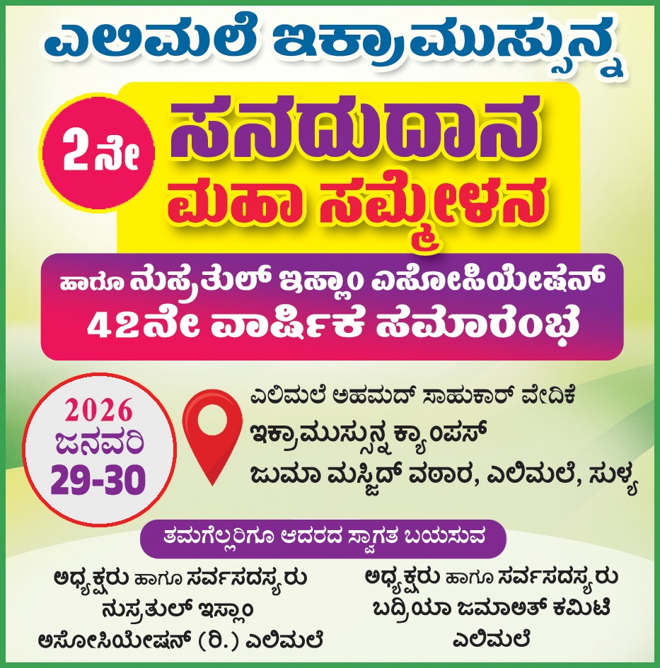 ಎಲಿಮಲೆ: ಇಕ್ರಾಮುಸ್ಸುನ್ನ 2ನೇ ಸನದುದಾನ ಮಹಾಸಮ್ಮೇಳನ ಹಾಗೂ ನುಸ್ರತುಲ್ ಇಸ್ಲಾಂ ಅಸೋಸಿಯೇಷನ್ 42ನೇ ವಾರ್ಷಿಕ ಸಮಾರಂಭ ಕಾರ್ಯಕ್ರಮ ಜ.29 ಮತ್ತು 30 ರಂದು ಎಲಿಮಲೆ ಜುಮ್ಮಾ ಮಸೀದಿ ವಠಾರದಲ್ಲಿ ನಡೆಯಲಿದೆ.ಜ.29 ರಂದು ಬೆಳಿಗ್ಗೆ 9.45 ಕ್ಕೆ ಧ್ವಜಾರೋಹಣ,10.ಕ್ಕೆ