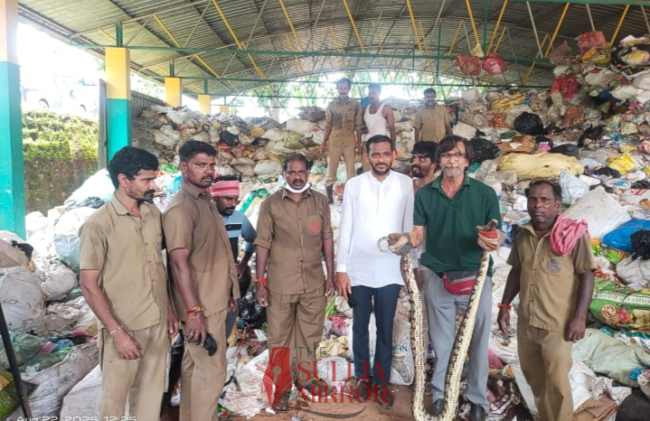 ಸುಳ್ಯ: ಸುಳ್ಯ ನಗರ ಪಂಚಾಯತ್ ಮುಂಭಾಗದ ಶೆಡ್ನಲ್ಲಿ ಹೆಬ್ಬಾವು ಸೇರಿಕೊಂಡಿರುವ ಘಟನೆ ನಡೆದಿದೆ. ನಗರ ಪಂಚಾಯತ್ ಮುಂಭಾಗದಲ್ಲಿ ತಿಂಗಳಿನಿಂದ ತುಂಬಿಡಲಾಗಿರುವ ಕಸವನ್ನು ಸಾಗಾಟ ಮಾಡಲು ಕಸವನ್ನು ತೆರವು ಮಾಡುವ ಸಂದರ್ಭದಲ್ಲಿ ಬೃಹತ್ ಗಾತ್ರದ ಹೆಬ್ಬಾವು ಕಂಡು ಬಂದಿದೆ. ಇದರಿಂದ ಕಾರ್ಮಿಕರು ಗಾಬರಿಗೊಂಡರು. ಬಳಿಕ ಅರಣ್ಯ ಇಲಾಖೆಗೆ ಮಾಹಿತಿ ನೀಡಲಾಯಿತು. ಸುಳ್ಯ ಅರಣ್ಯ ಇಲಾಖೆಯವರು ಆಗಮಿಸಿ ಹೆಬ್ಬಾವನ್ನು ಸೆರೆ ಹಿಡಿದು ಕಾಡಿಗೆ ಬಿಡಲಾಯಿತು ಎಂದು ತಿಳಿಸಲಾಯಿತು.