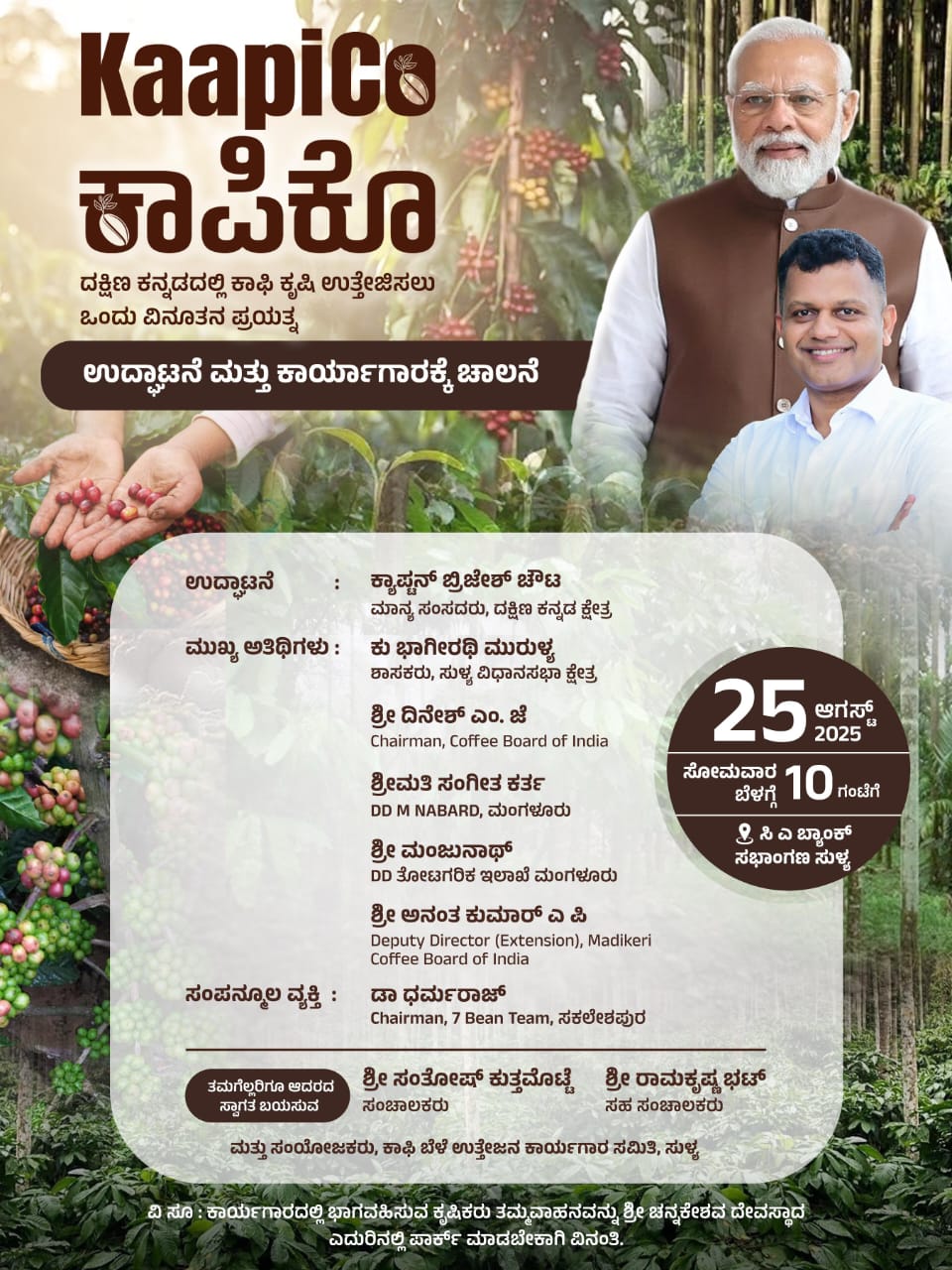 ಸುಳ್ಯ:ದಕ್ಷಿಣ ಕನ್ನಡ ಜಿಲ್ಲೆಯಲ್ಲಿ ಕಾಫಿ ಕೃಷಿ ಉತ್ತೇಜಿಸಲು ರೈತರಿಗೆ ಮಾರ್ಗದರ್ಶನ ನೀಡುವ ನಿಟ್ಟಿನಲ್ಲಿ ದ.ಕ.ಸಂಸದ ಕ್ಯಾಪ್ಟನ್ ಬ್ರಿಜೇಶ್ ಚೌಟ ಅವರ ನೇತೃತ್ವದಲ್ಲಿ ಕಾರ್ಯಾಗಾರ ‘ಕಾಫಿಕೊ’ ಆ.25ರಂದು ಸುಳ್ಯ ಸಿಎ ಬ್ಯಾಂಕ್ನ ಸಭಾಂಗಣದಲ್ಲಿ ನಡೆಯಲಿದೆ. ಹಳದಿ ರೋಗದಿಂದ ಕಂಗೆಟ್ಟ ಅಡಿಕೆ ಬೆಳೆಗಾರರ ನೆರವಿಗೆ ನಿಲ್ಲುವ ಮಹತ್ತರ ಯೋಜನೆಯಾಗಿ ಕಾಫಿ ಬೆಳೆಯನ್ನು ಪ್ರೋತ್ಸಾಹಿಸಲು