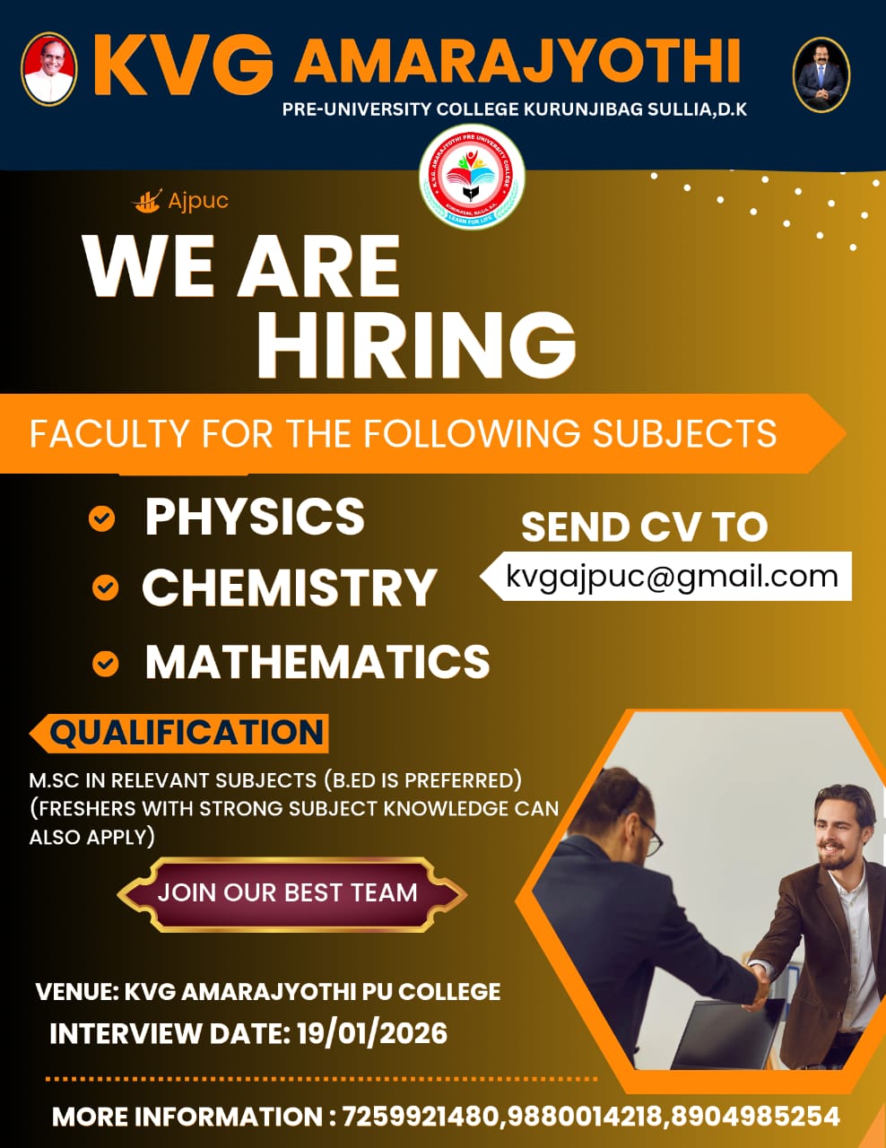 ಹುದ್ದೆಗಳ ಆಯ್ಕೆಗೆ 2026 ಜನವರಿ 19ರಂದು ಕೆವಿಜಿ ಅಮರಜ್ಯೋತಿ ಪದವಿಪೂರ್ವ ಕಾಲೇಜಿನಲ್ಲಿ ಸಂದರ್ಶನ ನಡೆಯಲಿದೆ.