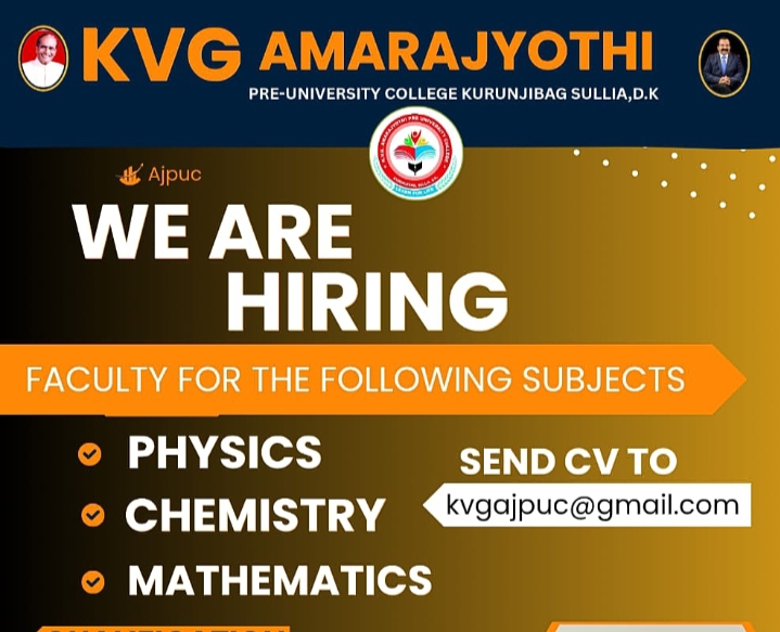 ಸುಳ್ಯ:ಡಾ.ರೇಣುಕಾಬಪ್ರಸಾದ್ ಕೆ.ವಿ. ಅವರ ನೇತೃತ್ವದ ಅಕಾಡೆಮಿ ಆಫ್ ಲಿಬರಲ್ ಎಜ್ಯುಕೇಷನ್ ‘ಕಮಿಟಿ ಬಿ’ ಪ್ರವರ್ತಿತ ಪ್ರತಿಷ್ಠಿತ ಕೆವಿಜಿ ಅಮರ ಜ್ಯೋತಿ ಪದವಿ ಪೂರ್ವ ಕಾಲೇಜಿನಲ್ಲಿ ಉಪನ್ಯಾಸಕರ ಹುದ್ದೆಗೆ ಅರ್ಜಿ ಆಹ್ವಾನಿಸಲಾಗಿದೆ. ಭೌತಶಾಸ್ತ್ರ (ಫಿಸಿಕ್ಸ್), ರಸಾಯನ ಶಾಸ್ತ್ರ (ಕೆಮಿಸ್ಟ್ರಿ) ಹಾಗೂ ಗಣಿತ( ಮ್ಯಾಥಮೆಟಿಕ್ಸ್) ವಿಷಯಗಳಲ್ಲಿ ಉಪನ್ಯಾಸಕರ ಹುದ್ದೆಗೆ