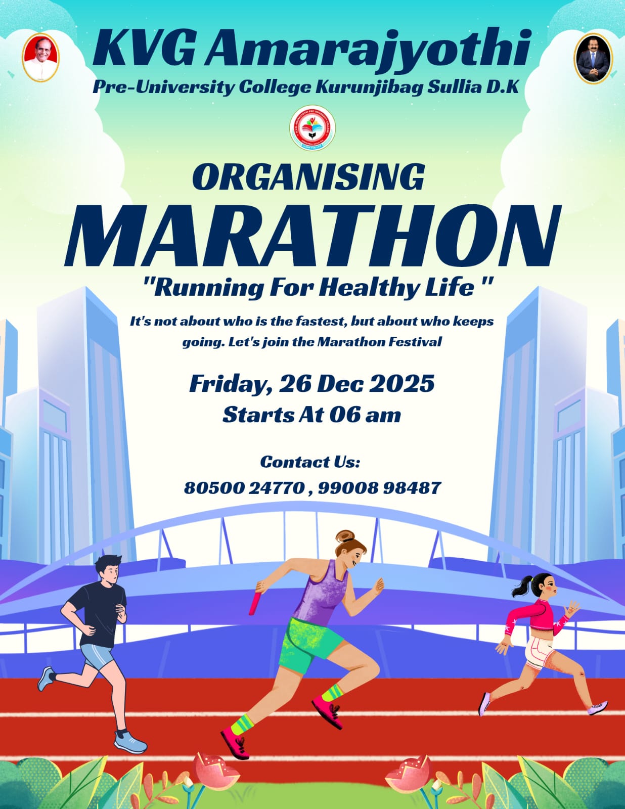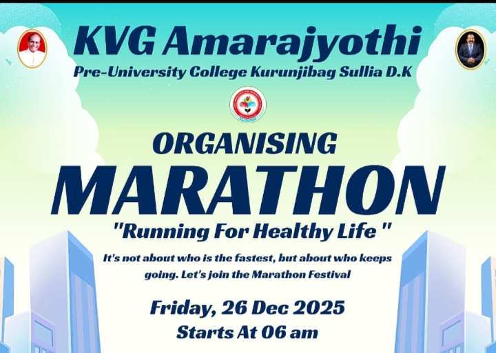 ಸುಳ್ಯ: ಸುಳ್ಯದ ಪ್ರತಿಷ್ಠಿತ ಶಿಕ್ಷಣ ಸಂಸ್ಥೆ ಕೆವಿಜಿ ಅಮರಜ್ಯೋತಿ ಪದವಿಪೂರ್ವ ಕಾಲೇಜಿನ ವತಿಯಿಂದ ಡಾ.ಕುರುಂಜಿ ವೆಂಕಟ್ರಮಣ ಗೌಡರ ಹುಟ್ಟುಹಬ್ಬ ದಿನವಾದ ಡಿ.26ರಂದು ಮ್ಯಾರಥಾನ್ ಓಟ ಹಮ್ಮಿಕೊಳ್ಳಲಾಗಿದೆ. ‘ಆರೋಗ್ಯವಂತ ಜೀವನಕ್ಕಾಗಿ ಓಟ’ ಎಂಬ