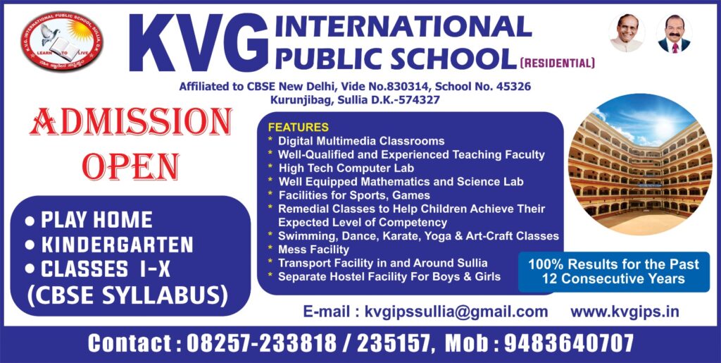 ಪ್ರತಿಷ್ಠಿತ ಶಿಕ್ಷಣ ಸಂಸ್ಥೆ ಕೆವಿಜಿ ಇಂಟರ್ನ್ಯಾಷನಲ್ ಪಬ್ಲಿಕ್ ಸ್ಕೂಲ್. ಸ್ಕೂಲ್ನಲ್ಲಿ 2026-26ನೇ ಶೈಕ್ಷಣಿಕ ವರ್ಷಕ್ಕೆ ಪ್ರವೇಶಾತಿ ಆರಂಭಗೊಂಡಿದೆ.ಪ್ರತಿವರ್ಷ ಶೇ.100 ಫಲಿತಾಂಶ ಪಡೆಯುವುದರ ಜೊತೆಗೆ