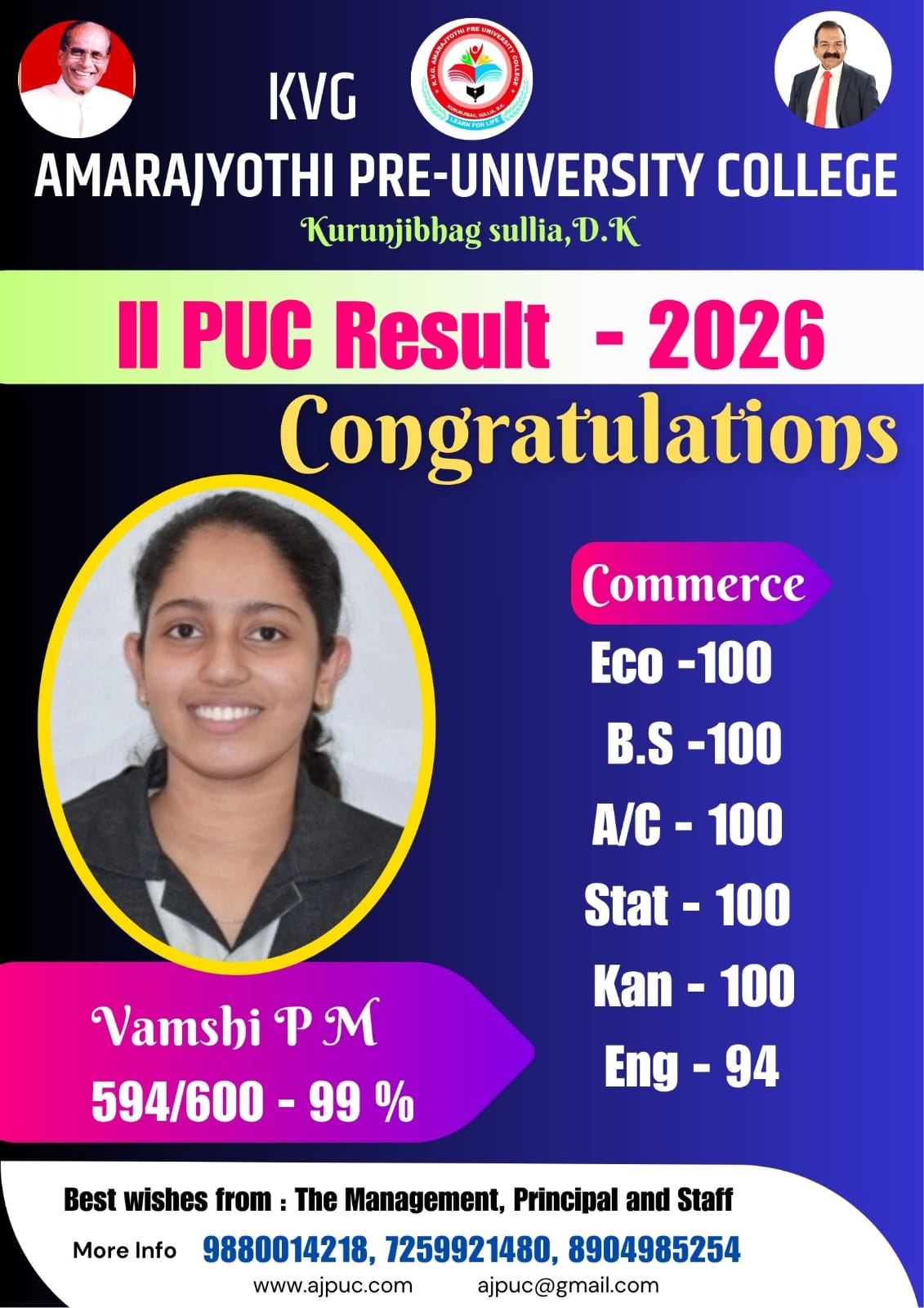 ವಾಣಿಜ್ಯ ವಿಭಾಗದಲ್ಲಿ ವಂಶಿ.ಪಿ.ಎಂ 594 ತಾಲೂಕಿಗೆ ಪ್ರಥಮ, ಹಿಮಾನಿ.ಬಿ 593 ತಾಲೂಕಿಗೆ ದ್ವಿತೀಯ ಹಾಗೂ ಹಾಗೂ ಜನನಿ.ಕೆ 590 ಅಂಕ ಗಳೊಂದಿಗೆ ತಾಲೂಕಿಗೆ ತೃತೀಯ ಸ್ಥಾನ ಪಡೆದಿದ್ದಾರೆ. ಒಟ್ಟು 24 ವಿದ್ಯಾರ್ಥಿಗಳು ಡಿಸ್ಟಿಂಕ್ಷನ್ನಲ್ಲಿ ಹಾಗೂ 20 ವಿದ್ಯಾರ್ಥಿಗಳು ಪ್ರಥಮ ದರ್ಜೆಯಲ್ಲಿ ತೇರ್ಗಡೆ ಹೊಂದಿದ್ದಾರೆ.
