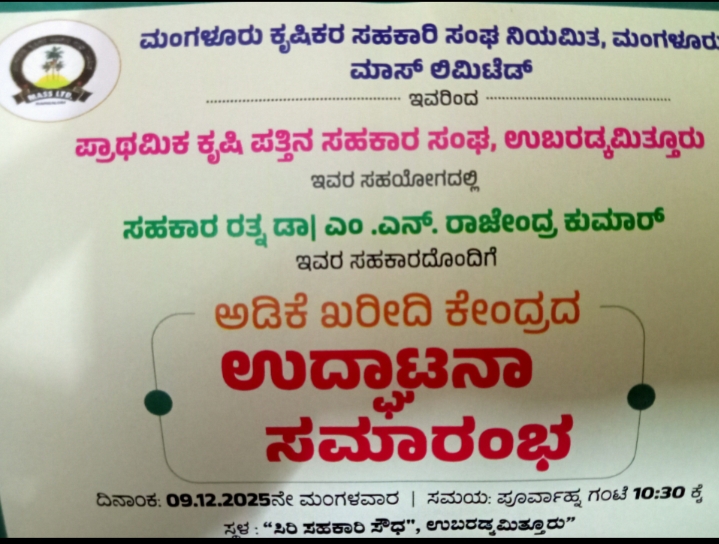 ಸುಳ್ಯ:ಮಂಗಳೂರು ಕೃಷಿಕರ ಸಹಕಾರಿ ಸಂಘ ನಿಯಮಿತ, ಮಂಗಳೂರು, ಮಾಸ್ ಲಿಮಿಟೆಡ್ ಇವರಿಂದ ಉಬರಡ್ಕ ಮಿತ್ತೂರು ಪ್ರಾಥಮಿಕ ಕೃಷಿ ಪತ್ತಿನ ಸಹಕಾರಿ ಸಂಘದ ಸಹಯೋಗದಲ್ಲಿ ಸಹಕಾರ ರತ್ನ ಡಾ.ಎಂ .ಎನ್. ರಾಜೇಂದ್ರ ಕುಮಾರ್ ಅವರ ಸಹಕಾರದೊಂದಿಗೆ ಅಡಿಕೆ ಖರೀದಿ ಕೇಂದ್ರದ ಉದ್ಘಾಟನಾ ಸಮಾರಂಭ ಡಿ. 9ರಂದು ಸಂಘದ ಸಿರಿ ಸಹಕಾರಿ ಸೌಧದಲ್ಲಿ ಪೂರ್ವಾಹ್ನ ಗಂಟೆ 10:30ರಿಂದ ನಡೆಯಲಿದೆ.