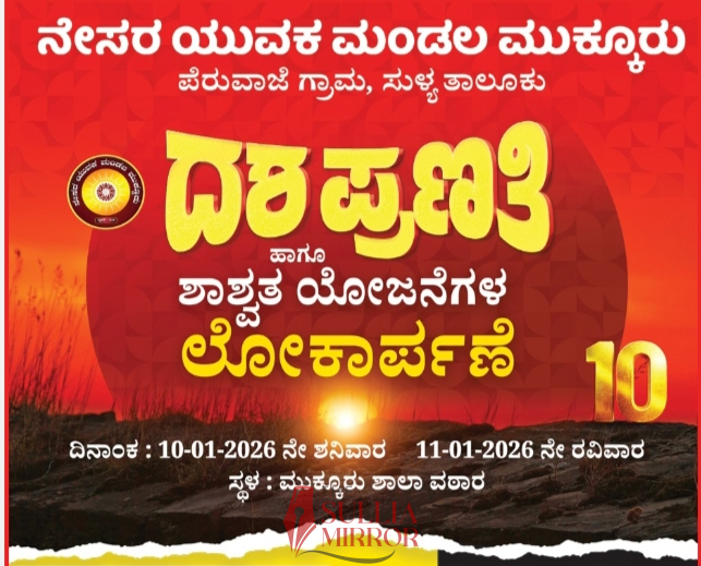ಸುಳ್ಯ:ಮುಕ್ಕೂರು ನೇಸರ ಯುವಕ ಮಂಡಲಕ್ಕೆ ಹತ್ತರ ಹರೆಯ.ಈ ಹಿನ್ನೆಲೆಯಲ್ಲಿ ಜ.10 ಮತ್ತು 11 ರಂದು ಮುಕ್ಕೂರು ಶಾಲಾ ವಠಾರದಲ್ಲಿ ದಶಪ್ರಣತಿ ಕಾರ್ಯಕ್ರಮ ಹಾಗೂ ಶಾಶ್ವತ ಯೋಜನೆಗಳ ಲೋಕಾರ್ಪಣೆಯು ನಡೆಯಲಿದೆ. ಇಂದು (ಜ.10) ಬೆಳಗ್ಗೆ 10ಕ್ಕೆ ಪ್ರಗತಿಪರ ಕೃಷಿಕರಾದ ಅನಿತಾ ಟಿ ಭಟ್ ಧ್ವಜಾರೋಹಣ ನೆರವೇರಿಸಲಿದ್ದಾರೆ. ಮುಕ್ಕೂರು ಶಾಲಾ ಎಸ್ ಡಿಎಂಸಿ ಅಧ್ಯಕ್ಷ ಜಯಂತ ಗೌಡ ಅಧ್ಯಕ್ಷತೆ ವಹಿಸಲಿದ್ದಾರೆ. ನೇಸರ ದಶಪ್ರಣತಿ ಸಮಿತಿಯ