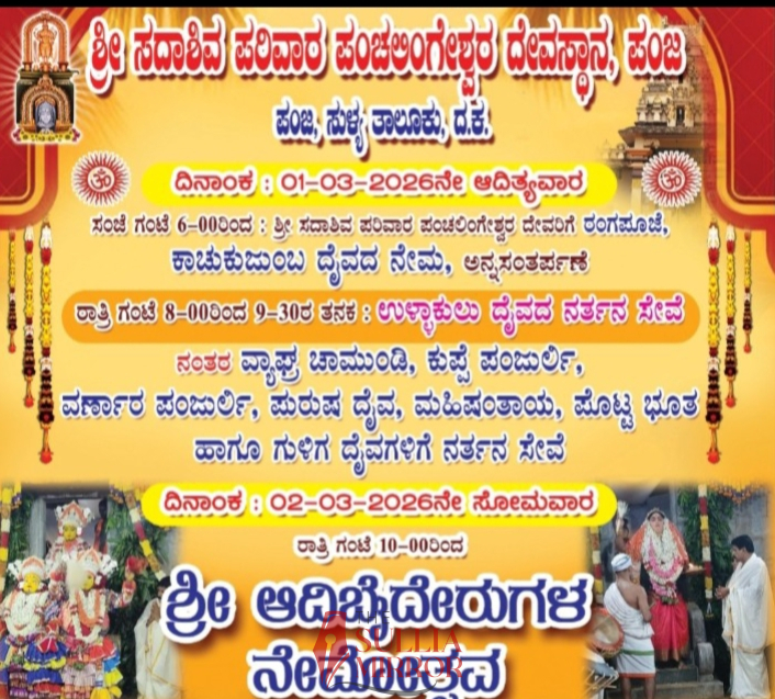ಸುಳ್ಯ:ಪಂಜ ಶ್ರೀ ಸದಾಶಿವ ಪರಿವಾರ ಪಂಚಲಿಂಗೇಶ್ವರ ದೇಗುಲದಲ್ಲಿ ಮಾ.1 ರಂದು ಶ್ರೀ ಸದಾಶಿವ ಪರಿವಾರ ಪಂಚಲಿಂಗೇಶ್ವರ ದೇವರಿಗೆ ರಂಗಪೂಜೆ ಮತ್ತು ಬೀದಿನೇಮ ನಡೆಯಲಿದೆ. ಸಂಜೆ ಗಂಟೆ 6 ರಿಂದ ರಂಗಪೂಜೆ, ಕಾಚುಕುಜುಂಬ ದೈವದ ನರ್ತನ ಸೇವೆ,