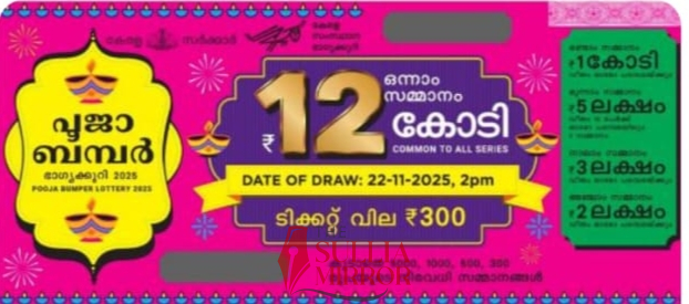 ತಿರುವನಂತಪುರಂ: ಕೇರಳ ರಾಜ್ಯ ಲಾಟರಿಯ ಪೂಜಾ ಬಂಪರ್ ಲಾಟರಿ ಟಿಕೆಟ್ನ ಡ್ರಾ ನ.22ರಂದು ನಡೆಯಿತು. JD 545542 ನಂಬರ್ಗೆ ಪ್ರಥಮ ಬಹುಮಾನ ಒಲಿದು ಬಂದಿದೆ. ಎರಡನೆ ಬಹುಮಾನವಾಗಿ