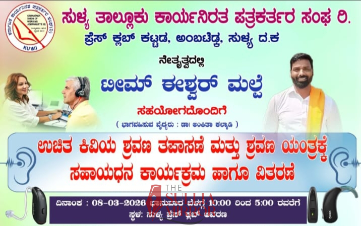 ಸುಳ್ಯ: ಸುಳ್ಯ ತಾಲೂಕು ಕಾರ್ಯನಿರತ ಪತ್ರಕರ್ತರ ಸಂಘದ ನೇತೃತ್ವದಲ್ಲಿ ಟೀಮ್ ಈಶ್ವರ್ ಮಲ್ಪೆ ಸಹಯೋಗದೊಂದಿಗೆ ಉಚಿತ ಕಿವಿಯ ಶ್ರವಣ ತಪಾಸಣೆ ಮತ್ತು ಶ್ರವಣ ಯಂತ್ರಕ್ಕೆ ಸಹಾಯಧನ ಕಾರ್ಯಕ್ರಮ ಹಾಗೂ ವಿತರಣೆ ಮಾ. 8 ರಂದು ಸುಳ್ಯ ಪ್ರೆಸ್ ಕ್ಲಬ್ ಆವರಣದಲ್ಲಿ ನಡೆಯಲಿದೆ ಎಂದು