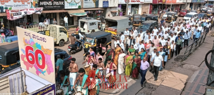 ಸುಳ್ಯ:ಸುಳ್ಯ ತಾಲೂಕು ರಚನೆಯಾಗಿ 60 ವರ್ಷ ತುಂಬಿದ ಹಿನ್ನಲೆಯಲ್ಲಿ ಸುಳ್ಯ 60 ಸಂಭ್ರಮಾಚರಣೆ ಸುಳ್ಯದ ಜಾನಕಿ ವೆಂಕಟ್ರಮಣ ಗೌಡ ಸಭಾಭವನದಲ್ಲಿ ನಡೆಯಿತು.ಕಾರ್ಯಕ್ರಮಕ್ಕೆ ಮುನ್ನ ಸುಳ್ಯ ನಗರದಲ್ಲಿ ವೈಭವದ ಆಕರ್ಷಕ ಮೆರಚಣಿಗೆ ನಡೆಯಿತು.ಬೆಳಿಗ್ಗೆ ಸುಳ್ಯದ ಶಾಸ್ತ್ರಿ ವೃತ್ತದಿಂದ ಶ್ರೀ ಕುರುಂಜಿ ಜಾನಕಿ ವೆಂಕಟ್ರಮಣ ಸಭಾಂಗಣದವರೆಗೆ