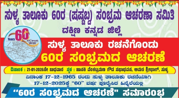 ಸುಳ್ಯ:ಸುಳ್ಯ ತಾಲೂಕು ರಚನೆಯಾಗಿ 60 ವರ್ಷ ತುಂಬಿದ ಹಿನ್ನಲೆಯಲ್ಲಿ ಸುಳ್ಯ 60 ಸಂಭ್ರಮಾಚರಣೆ ಇಂದು (ಜ.21) ಸುಳ್ಯದ ಜಾನಕಿ ವೆಂಕಟ್ರಮಣ ಗೌಡ ಸಭಾಭವನದಲ್ಲಿ ನಡೆಯಲಿದೆ.