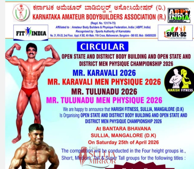 ಸುಳ್ಯ:ಕರ್ನಾಟಕ ಅಮೆಚೂರ್ ಬಾಡಿ ಬಿಲ್ಡರ್ಸ್ ಅಸೋಸೊಯೇಷನ್ ಮತ್ತು ಸುಳ್ಯದ ಹರೀಶ್ ಫಿಟ್ನೆಸ್ ನೇತೃತ್ವದಲ್ಲಿ ರಾಜ್ಯ ಮಟ್ಟದ ಹಾಗೂ ಜಿಲ್ಲಾ ಮಟ್ಟದ ದೇಹದಾರ್ಢ್ಯ ಸ್ಪರ್ಧೆ ಏ.25ರಂದು ಸುಳ್ಯದ ಬಂಟರ ಭವನದಲ್ಲಿ ನಡೆಯಲಿದೆ. ಮುಕ್ತ ರಾಜ್ಯ ಮಟ್ಟದಲ್ಲಿ ಮಿಸ್ಟರ್ ಕರಾವಳಿ ಮತ್ತು ಮಿಸ್ಟರ್ ಕರಾವಳಿ ಮೆನ್ ಫಿಸಿಕ್ ಹಾಗೂ ಜಿಲ್ಲಾ ಮಟ್ಟದಲ್ಲಿ ಮಿಸ್ಟರ್ ತುಳುನಾಡು ಮತ್ತು