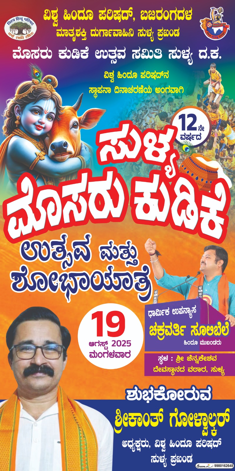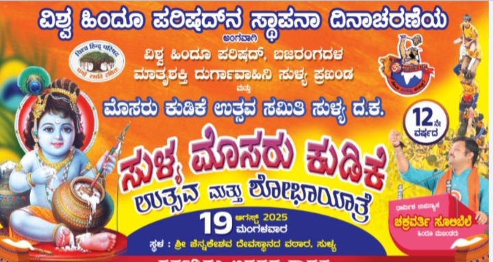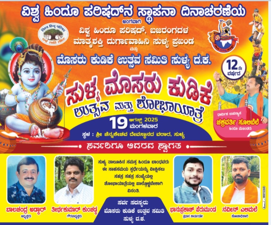 ಸುಳ್ಯ:ವಿಶ್ವ ಹಿಂದೂ ಪರಿಷತ್, ಬಜರಂಗದಳ,ಮಾತೃ ಶಕ್ತಿ ದುರ್ಗಾ ವಾಹಿನಿ ಸುಳ್ಯ ಪ್ರಖಂಡ ಮತ್ತು ಮೊಸರು ಕುಡಿಕೆ ಉತ್ಸವ ಸಮಿತಿ ಸುಳ್ಯ ಇದರ ಆಶ್ರಯದಲ್ಲಿ ವಿಶ್ವ ಹಿಂದೂ ಪರಿಷತ್ನ ಸ್ಥಾಪನಾ ದಿನಾಚರಣೆಯ ಅಂಗವಾಗಿ 12ನೇ ವರ್ಷದ ಸುಳ್ಯ ಮೊಸರು ಕುಡಿಕೆ ಉತ್ಸವ ಮತ್ತು ಶೋಭಾಯಾತ್ರೆ ಇಂದು ಸುಳ್ಯದ