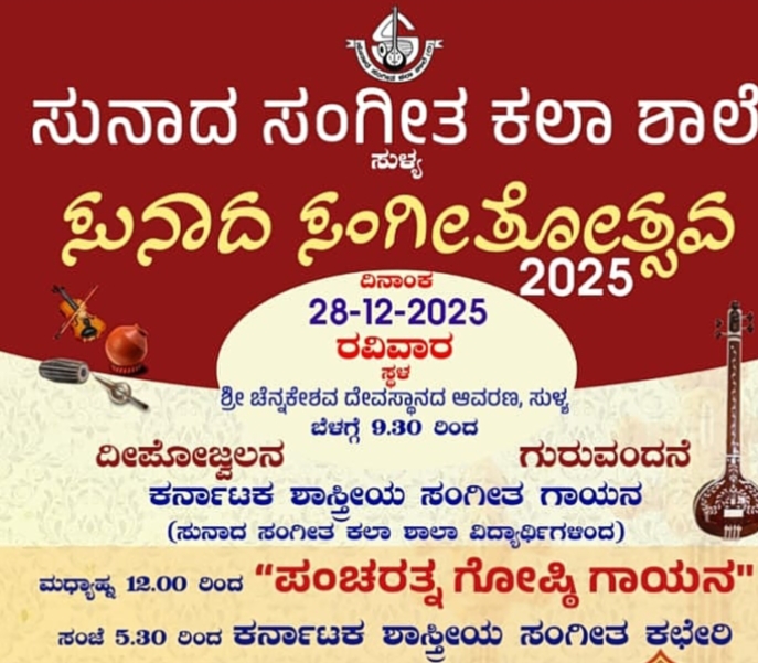ಸುಳ್ಯ:ಸುನಾದ ಸಂಗೀತ ಕಲಾ ಶಾಲೆಯ ಸುಳ್ಯ ಶಾಖೆಯ ವತಿಯಿಂದ ಸುನಾದ ಸಂಗೀತೋತ್ಸವ ಡಿ.28ರಂದು ಸುಳ್ಯ ಶ್ರೀ ಚೆನ್ನಕೇಶವ ದೇವಸ್ಥಾನದ ಆವರಣದಲ್ಲಿ ನಡೆಯಲಿದೆ.ದಿನಪೂರ್ತಿ ನಡೆಯುವ ಸಂಗೀತೋತ್ಸವದ ಅಂಗವಾಗಿ
