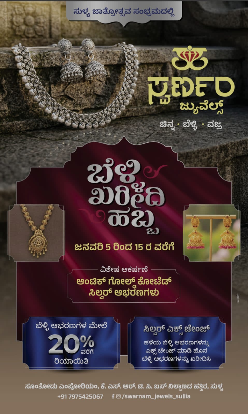 ಜನವರಿ 5 ರಿಂದ ಜ.15 ರವರೆಗೆ ಬೆಳ್ಳಿ ಖರೀದಿ ಹಬ್ಬ ನಡೆಯಲಿದ್ದು, ಪ್ರತೀ ಬೆಳ್ಳಿ ಆಭರಣಗಳ ಮೇಲೆ 20% ರವರೆಗೆ ರಿಯಾಯಿತಿ ನೀಡಲಾಗುತ್ತಿದೆ. ಅಲ್ಲದೇ ಸಿಲ್ವರ್ ಎಕ್ಸೇಂಜ್ ಆಫರ್ ಇದ್ದು ಹಳೆಯ ಬೆಳ್ಳಿ ಆಭರಣಗಳನ್ನು ಎಕ್ಸ್ಚೇಂಜ್ ಮಾಡಿ ಹೊಸ ಆಭರಣಗಳನ್ನು ಖರೀದಿಸಲು ಉತ್ತಮ ಅವಕಾಶವನ್ನು ಸ್ವರ್ಣಂ ಜ್ಯುವೆಲ್ಸ್ ಗ್ರಾಹಕರಿಗೆ ನೀಡಿದೆ.