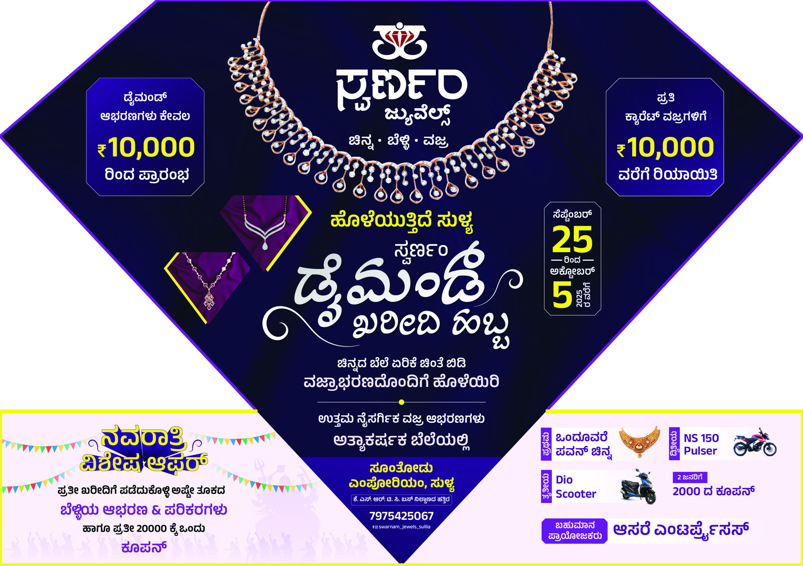ಸುಳ್ಯ:ಕಳೆದ ಕೆಲವು ತಿಂಗಳಿನಿಂದ ಸುಳ್ಯದಲ್ಲಿ ಸ್ವರ್ಣಂ ಹೊಳೆಯುತಿದೆ...! ಹೌದು ಸುಳ್ಯದಲ್ಲಿ ಸ್ವರ್ಣಂ ಜುವೆಲ್ಸ್ ಚಿನ್ನಾಭರಣ ಮಳಿಗೆ ಆರಂಭಗೊಂಡ ಬಳಿಕ ಸುಳ್ಯದ ಹೊಳಪು ಹೆಚ್ಚಿದೆ.ಇದೀಗ ಇನ್ನಷ್ಟು ಹೊಳಪು ಹೆಚ್ಚಿಸಲು ಸ್ವರ್ಣಂ ಜ್ಯುವೆಲ್ಸ್ ನಲ್ಲಿ ‘ಡೈಮಂಡ್ ಖರೀದಿ ಹಬ್ಬ’ ಆರಂಭಗೊಂಡಿದೆ.