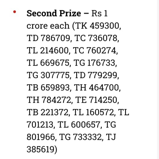 20 ಮಂದಿಗೆ ತಲಾ ಒಂದು ಕೋಟಿ, ತೃತೀಯ ಬಹುಮಾನ 50 ಲಕ್ಷ ತಲಾ 20 ಮಂದಿಗೆ ಲಭಿಸಲಿದೆ. ನಾಲ್ಕನೇ ಬಹುಮಾನ ತಲಾ 5 ಲಕ್ಷ 10 ಸೀರಿಯಲ್ಗಳಿಗೆ, 5ನೇ ಬಹುಮಾನ ತಲಾ 2 ಲಕ್ಷ 10 ಸೀರಿಯಲ್ ಟಿಕೆಟ್ಗಳಿಗೆ ಲಭಿಸಲಿದೆ.