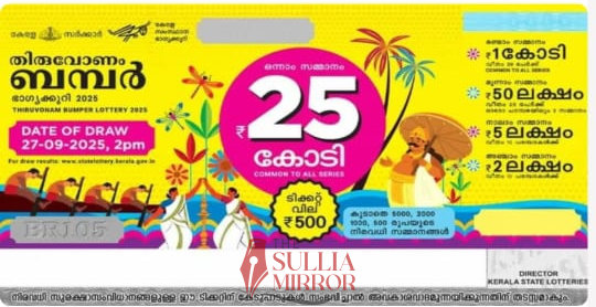 ತಿರುವನಂತಪುರಂ: 25 ಕೋಟಿ ಮೊದಲ ಬಹುಮಾನದ ಕೇರಳ ಸರಕಾರದ ತಿರುವೋಣಂ ಬಂಪರ್ ಟಿಕೆಟ್ನ ಡ್ರಾ ಇಂದು ನಡೆದಿದೆ. ಪ್ರಥಮ ಬಹುಮಾನ TH 577825 ಎಂಬ ಟಿಕೆಟ್ಗೆ ಲಭಿಸಿದೆ. ಇತರ ಸೀರಿಯಲ್ಗಳ ಇದೇ ನಂಬರ್ಗೆ 5 ಲಕ್ಷ ಸಮಾಧಾನಕರ ಬಹುಮಾನ ದೊರೆಯಲಿದೆ. ದ್ವಿತೀಯ ಬಹುಮಾನವಾಗಿ