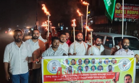 ಸುಳ್ಯ:ವಿಪಕ್ಷ ನಾಯಕ ರಾಹುಲ್ ಗಾಂಧಿ ನೇತೃತ್ವದಲ್ಲಿ ನಡೆಯುತ್ತಿರುವ ಮತಗಳ್ಳತನ ವಿರುದ್ದದ ಹೋರಾಟಕ್ಕೆ ಬೆಂಬಲವಾಗಿ ಸುಳ್ಯ ಯುವ ಕಾಂಗ್ರೆಸ್ ವತಿಯಿಂದ ಬೃಹತ್ ಪಂಜಿನ ಮೆರವಣಿಗೆ ಶನಿವಾರ ಸುಳ್ಯ ನಗರದಲ್ಲಿ ನಡೆಯಿತು.ಪ್ರತಿಭಟನಾ ಸಭೆಯಲ್ಲಿ ಕಾಂಗ್ರೆಸ್ ವಕ್ತಾರ ಎಂ.ಜಿ ಹೆಗಡೆ ಮುಖ್ಯ ಭಾಷಣ ಮಾಡಿದರು. ಪ್ರತಿಭಟನಾ ಸಭೆಯಲ್ಲಿ ಜಿಲ್ಲಾ